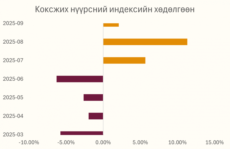 Монгол Улсаас БНХАУ руу гаргасан нүүрсний экспорт 2025 оны есдүгээр сард 62 сая тонн болж, оны дүнгээр өмнөх оны мөн үеэс 33%-иар өсжээ. Монголын 5-р ангиллын коксжих нүүрсний үнэ есдүгээр сарын байдлаар тонн тутамд дунджаар 1,400–1,500 ам.доллар хүрсэн нь оны эхний хагастай харьцуулахад тогтвортой өсөлт үзүүлжээ. Хятадын дотоодын гангийн үйлдвэрүүдийн түүхий эдийн эрэлт нэмэгдэж, нийлүүлэлт хязгаарлагдсан нь үнийн өсөлтийг дэмжсэн байна.