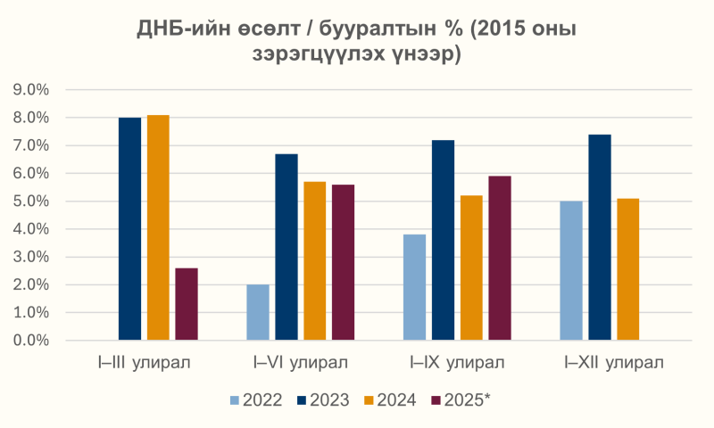 Үндэсний статистикийн хорооноос мэдээлснээр, 2025 оны эхний 9 сард Монгол Улсын ДНБ (2015 оны зэрэгцүүлэх үнээр) 5.9% өсөж, 24.3 их наяд төгрөгт хүрсэн нь эдийн засгийн өсөлт тогтвортой байгаа боловч бүтцийн өөрчлөлтүүд эрсдэл дагуулж буйг харуулж байна. Өсөлтийн 33.8%-ийг хөдөө аж ахуй, 8.2%-ийг уул уурхай, 10.6%-ийг үйлдвэрлэл, барилга салбарууд бүрдүүлсэн бол үйлчилгээний салбарын нөлөө суларсан нь эдийн засгийн тэнцвэрт байдалд сорилт үүсгэж байна.