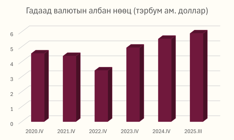 Монголбанк 2025 оны 12-р сарын 2-ны өдрийн эцсийн байдлаар Монгол Улсын гадаад валютын улсын нөөц 6.01 тэрбум ам.долларт хүрч, түүхэн дээд түвшин тогтоосныг мэдээллээ. Энэ өсөлтийн гол хөдөлгөгч хүчин нь уул уурхайн бүтээгдэхүүний экспортын эрчимжилт бөгөөд нүүрс, зэс зэрэг гол нэрийн бүтээгдэхүүний гадаад борлуулалт нэмэгдсэнээр төлбөрийн тэнцэл эерэг чиглэлд шилжиж, валютын урсгал бодитоор өсжээ.