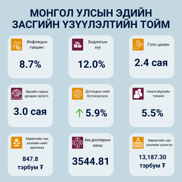 ⇒ МОНГОЛБАНК: БОДЛОГЫН ХҮҮГ 12%-Д ХЭВЭЭР ХАДГАЛЖ, ТЭТГЭВРИЙН ЗЭЭЛИЙН НӨХЦӨЛИЙГ ЗӨӨЛРҮҮЛЛЭЭ.