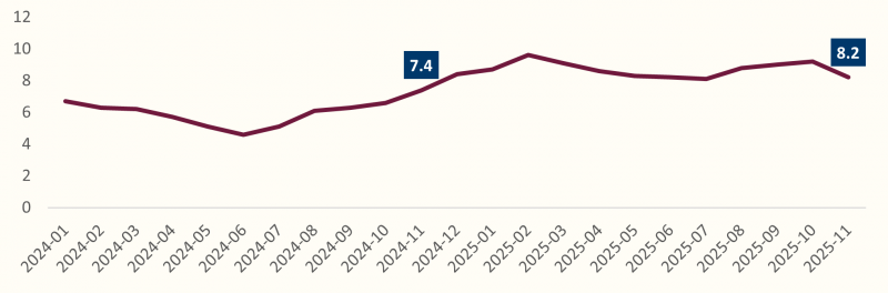 Инфляцын түвшин буюу ХҮИ 2024 оны 11-р сард 7.4% байсан бол энэ оны 11 сард 8.2% болж, өсөлтийн хурдац өмнөх оны мөн үеэс 0.8 нэгж хувиар нэмэгдсэн байна. Улсын инфляцад бензин, түлшнээс бусад импортын барааны үнэ 26.9%-иар, мах, хатуу түлшнээс бусад дотоодын барааны үнэ 51.6%-иар тус тус өссөн нь нөлөөлжээ.