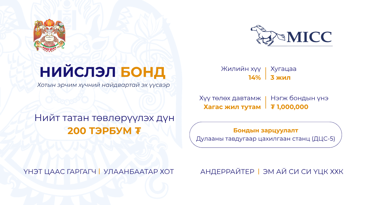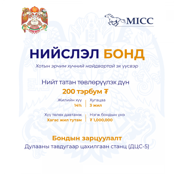 "Эм Ай Си Си" ҮЦК ХХК нь тогтвортой өгөөж бүхий хөрөнгө оруулалтын энэхүү боломжийг дотоодын хөрөнгө оруулагчдад санал болгож байна.