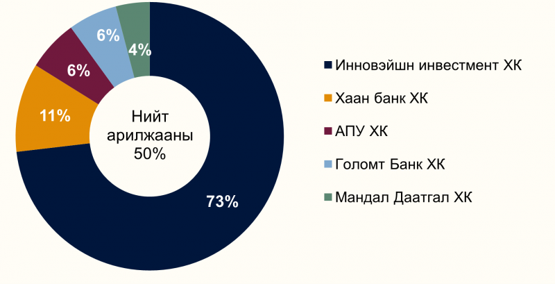 Нийт гүйлгээний 56.7% буюу 106.7 тэрбум төгрөгийг анхдагч зах зээл, харин 43.3% буюу 81.6 тэрбум төгрөгийг хоёрдогч зах зээл бүрдүүлсэн нь шинэ гаргалт, санхүүжилтийн үйл ажиллагаа зах зээлд давамгайлж байгааг харуулж байна.