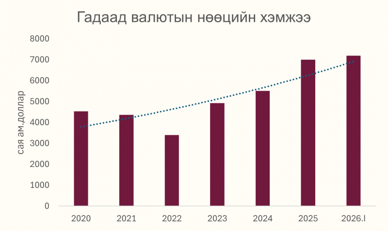 Монгол Улсын гадаад валютын албан нөөц 2026 оны 1 дүгээр улирлын эцсийн байдлаар 7.19 тэрбум ам.долларт хүрч, оны эхнээс 182.5 сая ам.доллароор нэмэгдэн түүхэн дээд түвшинд хүрлээ.