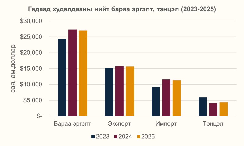 2025 онд гадаад худалдааны тэнцэл 4.4 тэрбум ам.долларын ашигтай гарлаа.